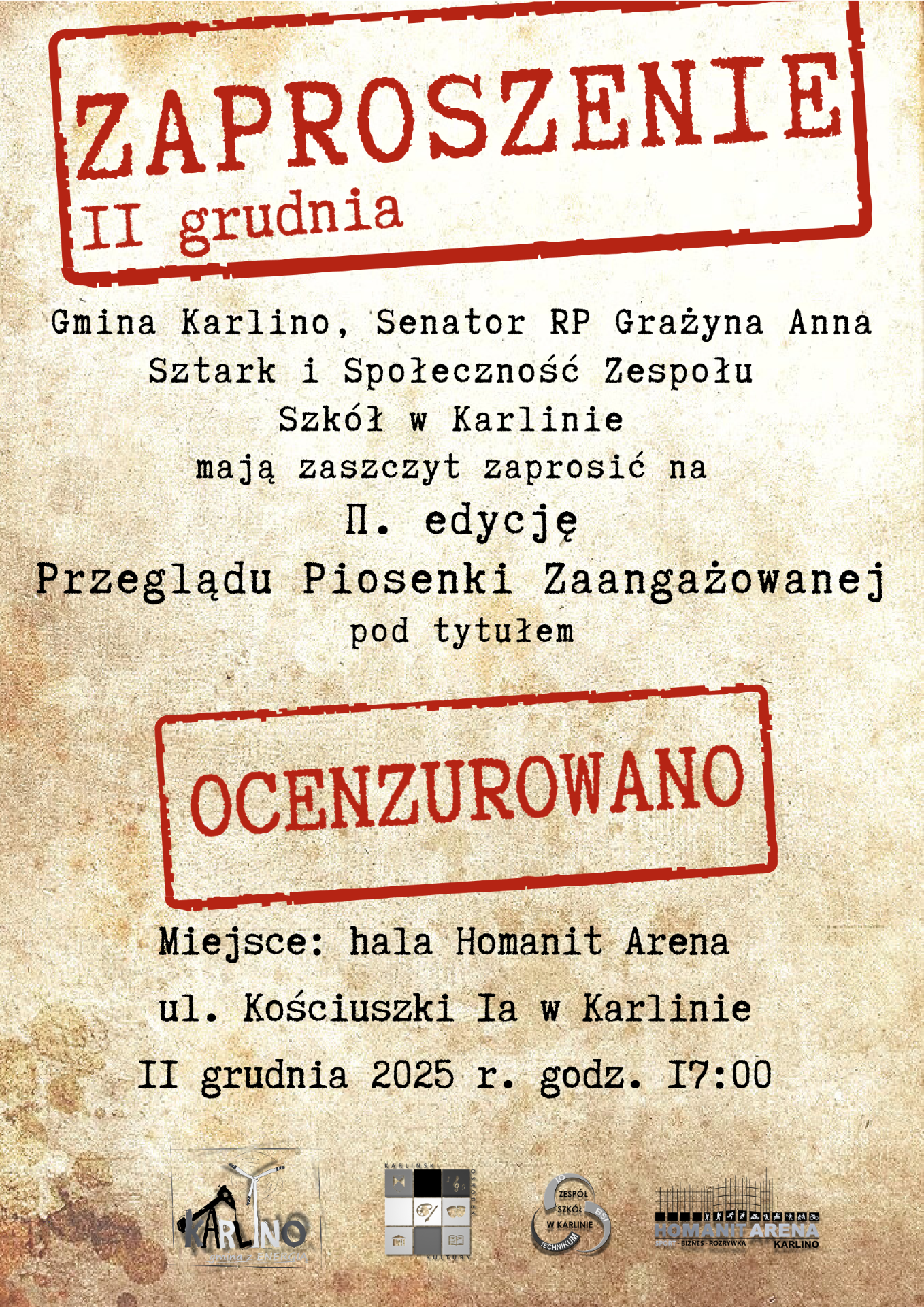 Serdecznie zapraszamy wszystkich mieszkańców na II edycję Przeglądu Piosenki Prawdziwej pt. Ocenzurowano. Odbędzie się ona 11 grudnia o godz. 17:00 w hali Homanit Arena. To wydarzenie będzie okazją, by wspólnie przeżyć wieczór pełen emocji, dobrej muzyki i artystycznych interpretacji.