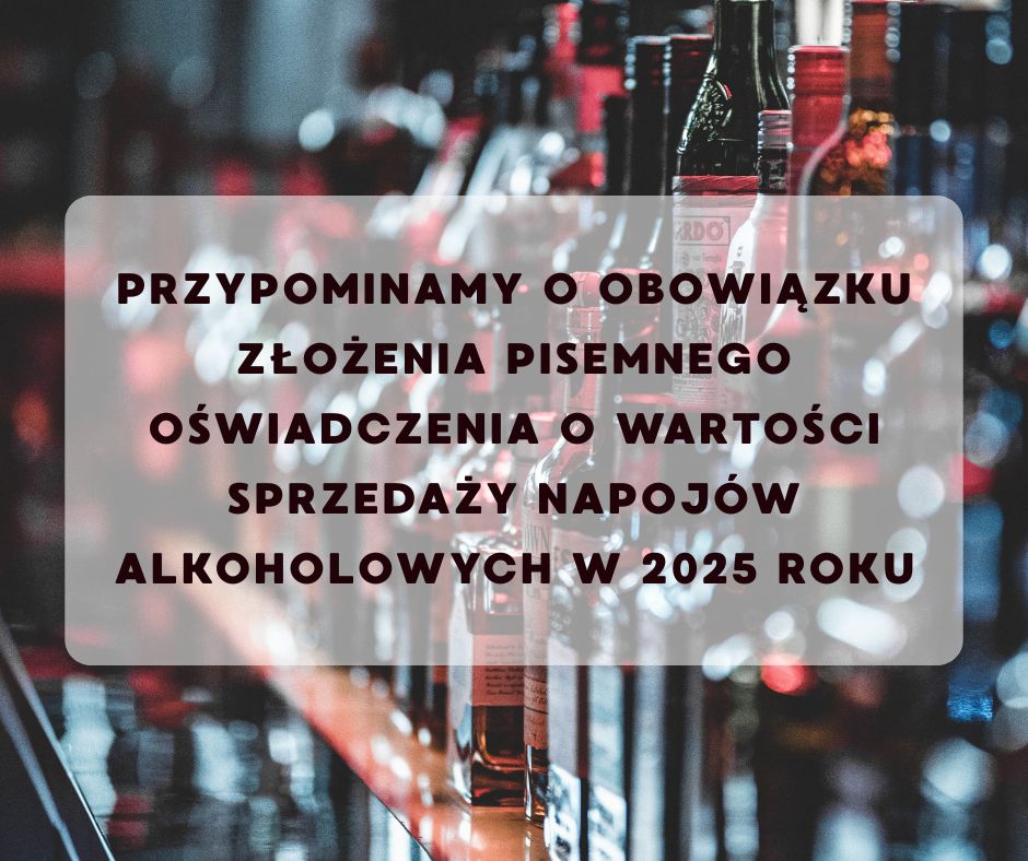 Przypominamy o obowiązku złożenia pisemnego oświadczenia o wartości sprzedaży (brutto z uwzględnieniem podatku od towarów i usług oraz podatku akcyzowego) poszczególnych rodzajów napojów alkoholowych w roku 2025 roku i wniesienia opłaty za korzystanie z zezwoleń na sprzedaż napojów alkoholowych w roku 2026 roku w terminie do dnia 31 stycznia 2026 r. Termin ten jest nieprzekraczalny, a spóźnienie będzie skutkować koniecznością dokonania wysokiej opłaty dodatkowej, a nawet wygaśnięciem (utratą) zezwolenia.