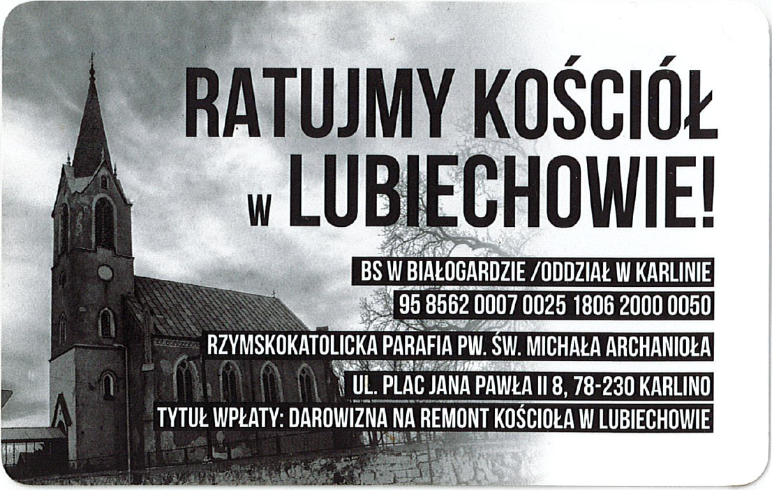 Mimo to, współpracując z samorządem i proboszczem karlińskiej parafii trochę już udało się zdziałać. Dotychczas zebrano ok. 180 tys. zł. – Dzięki sponsorom, pomocy samorządów gminnego i powiatowego, niemałej ofiarności samych mieszkańców wymieniono dach nad prezbiterium i dwiema zakrystiami, potłuczone okna zastąpiły nowe przeszklenia, wymieniono mocno zniszczone drzwi – informują członkowie komitetu ds. remontu. Przed ratującymi zabytek jednak nadal ogrom pracy. Dlatego wciąż szukają przyjaciół dla swojego kościoła. Osoby, które chciałyby dołożyć swoją cegiełkę, mogą to zrobić także ofiarowując fanty na planowany festyn. Ofiarodawców zapraszamy do kontaktu przez stronę FB Kościół w Lubiechowie, lub telefonicznie pod numerami: 660-760-620 i 604-641-122. Cały czas także można dokonywać wpłat na konto